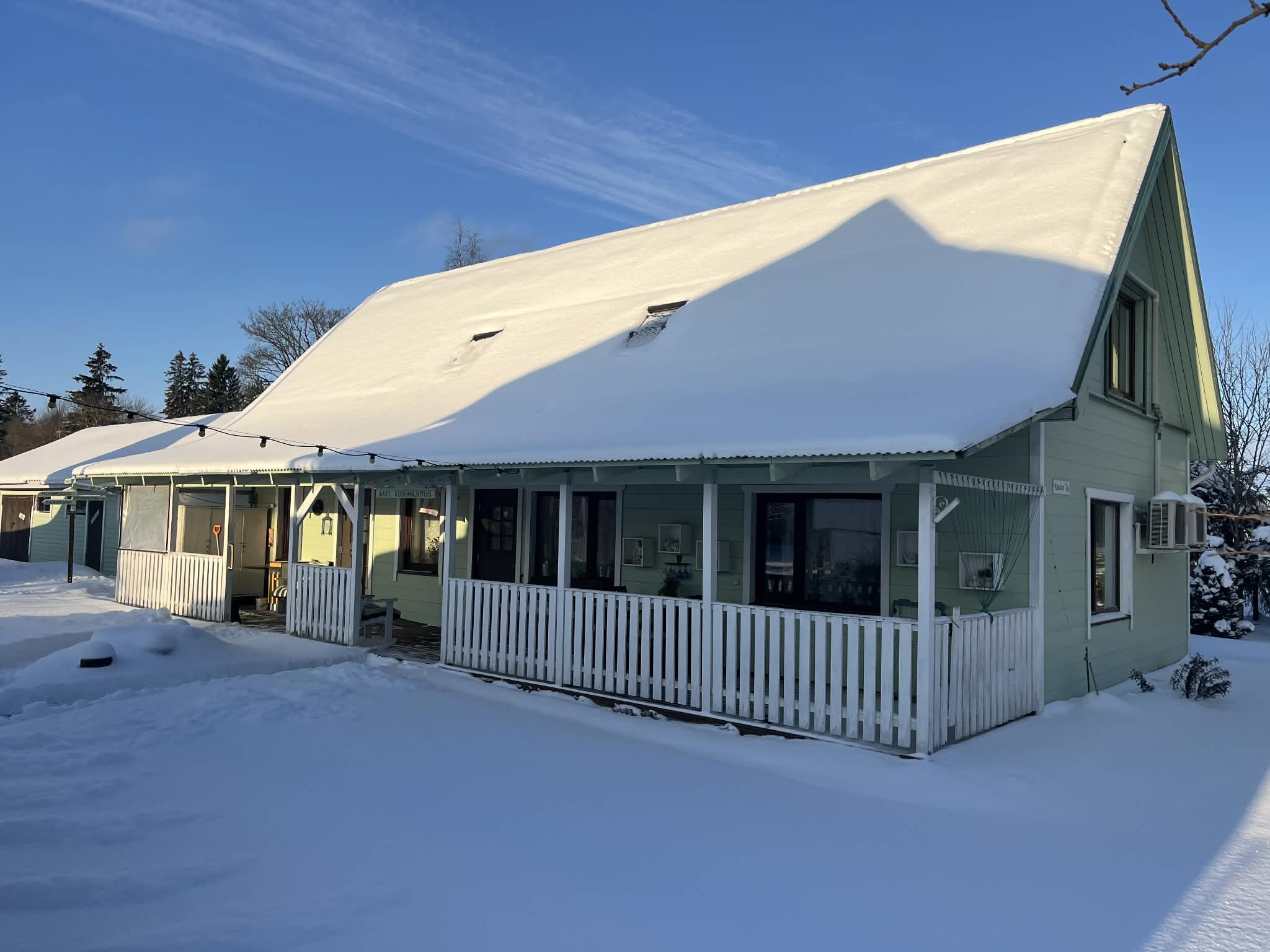 TALVEL: Suurema lumega on aias avatud päkapikurajad 😉 Kui tellite kõrvalmajas asuva sauna, siis saate ennast jahutada lumes või lõõtsutada kasvuhoones, mis talveks on sätitud laudade ja toolidega õdusaks istumiskohaks.